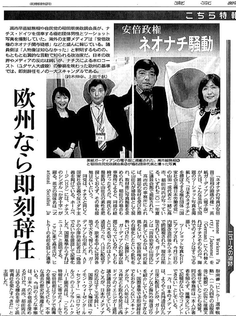 | <『ヒトラー選挙戦略』に推薦文を寄せたり、安倍改造内閣に入閣した際にはネオナチ団体代表とツーショット写真を撮っていたことも発覚するなどウルトラタカ派> 高市早苗氏、自民党総裁選への出馬を表明 “サナエノミクス”3本の矢も(ABEMA TIMES) |